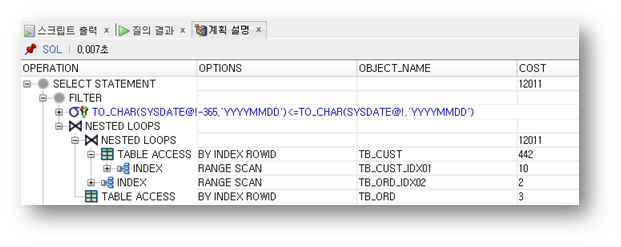 이러한 상황에서는 TB_CUST 테이블의 결과 집합의 건수만큼 TB_ORD 테이블을 테이블 풀 스캔하게 된다