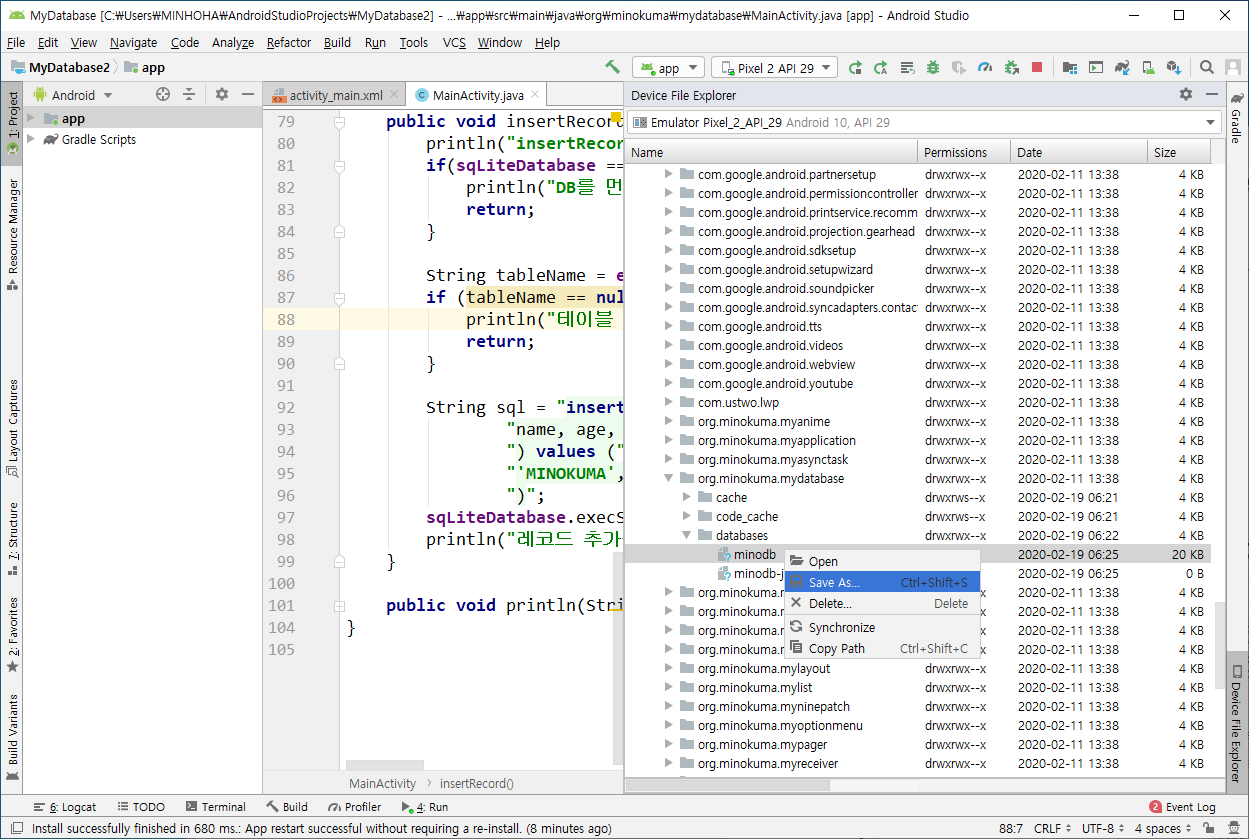 에뮬레이터에서 PC로 DB 저장이 된 것을 확인 후