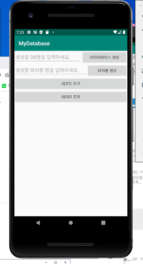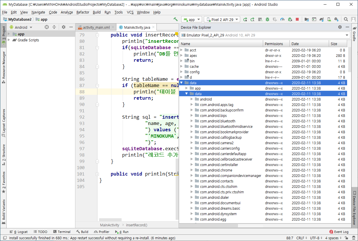 애뮬레이터에서 SQL을 실행했던 데이터들이 들어있음을 확인