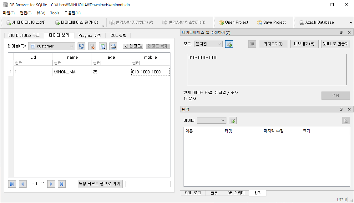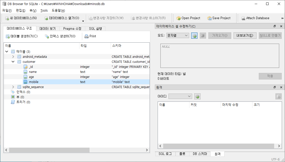 SQLite 로 저장한 DB 를 열어보면, 위에서 생성했던 테이블 확인 가능