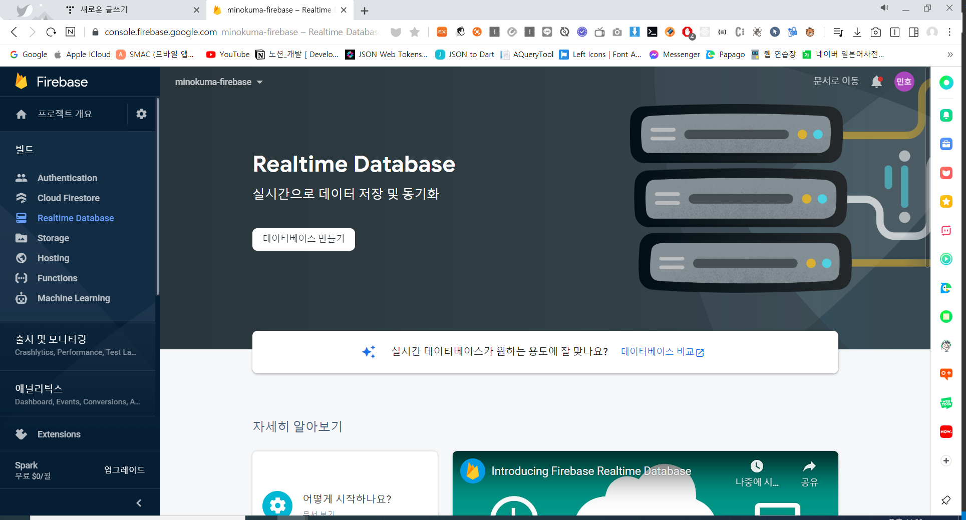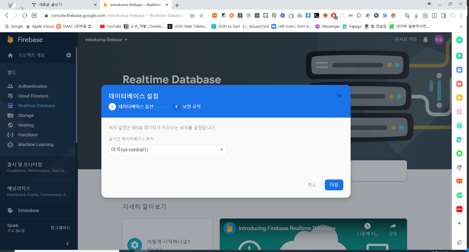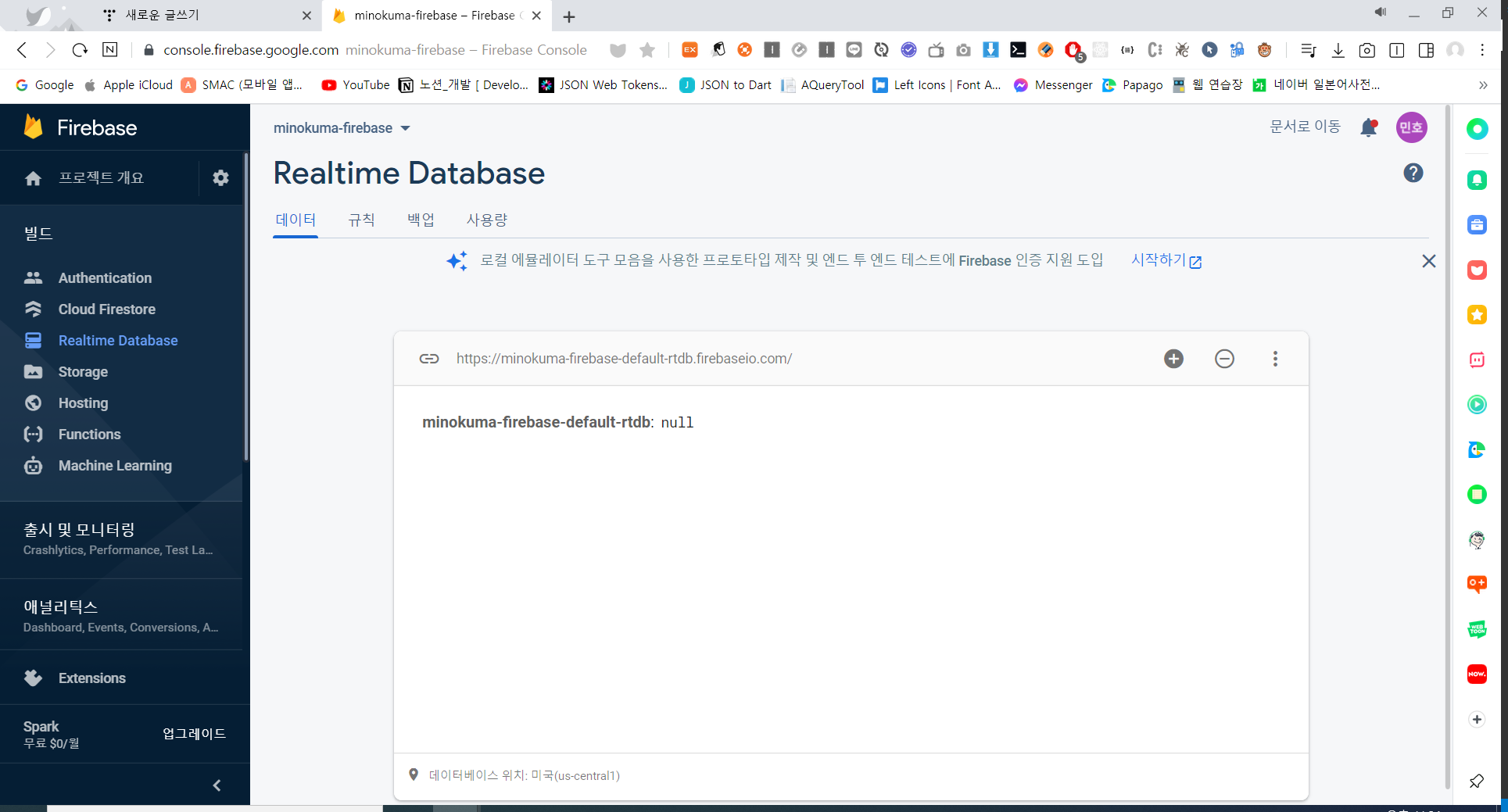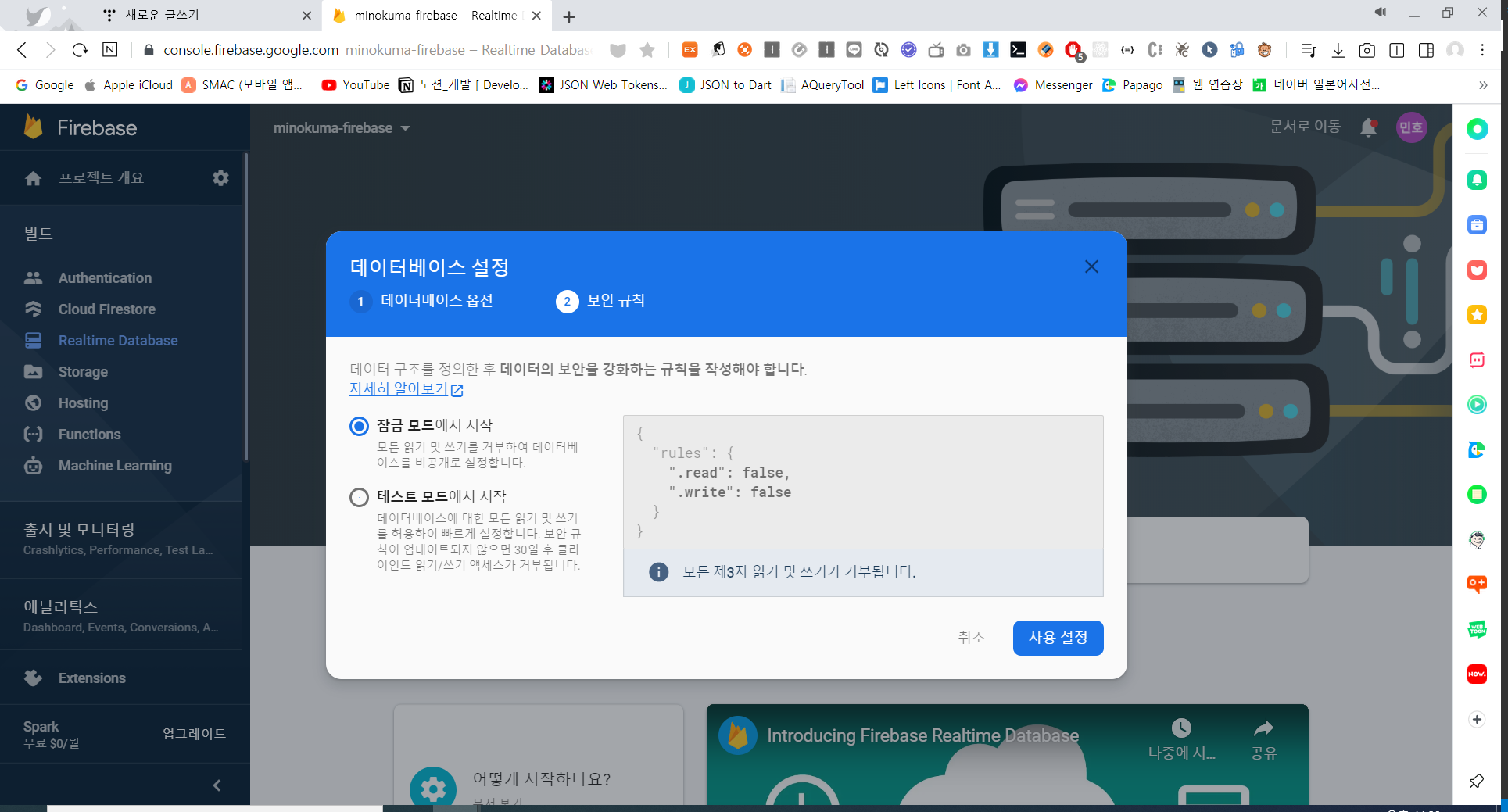 파이어베이스 좌측 메뉴 > Realtime Database > 데이터베이스 만들기 클릭