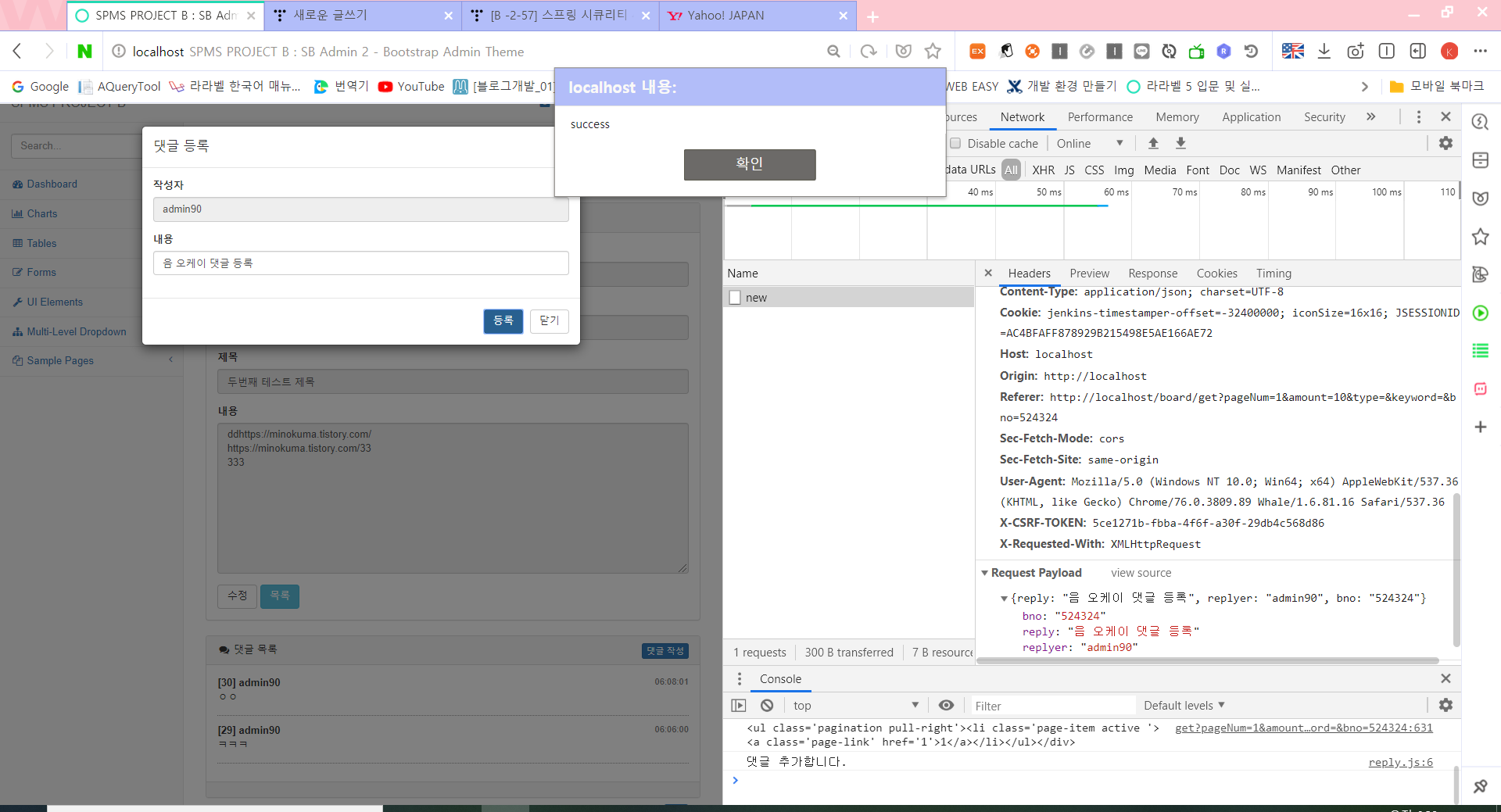 댓글의 등록 : CSRF 토큰을 같이 전송하도록 수정해야 한다.