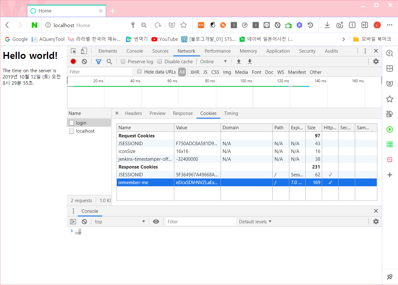 프로젝트를 실행하고 Remember-me 를 체크한 후 브라우저에서 쿠키를 조사해보면 자동으로 remember-me 라는 이름의 쿠키가 생긴 것을 확인할 수 있다.